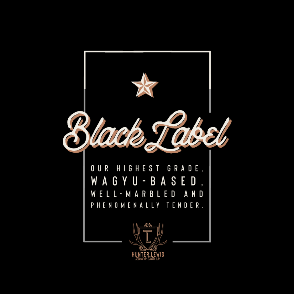 Our highest grade. Hunter Lewis Black Label beef has a heavier wagyu influence and contains the highest levels of fine marbling, lowest fat melting point, and maintains overall high tenderness and flavor. The commercial market would simply label this beef as « wagyu ».